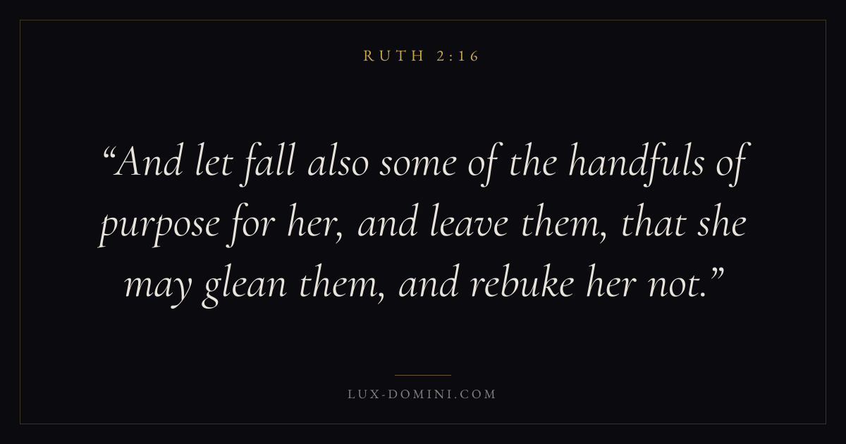 And let fall also some of the handfuls of purpose for her, and leave them, that she may glean them, and rebuke her not.