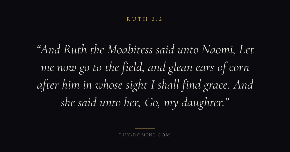 And Ruth the Moabitess said unto Naomi, Let me now go to the field, and glean ears of corn after him in whose sight I shall find grace. And she said unto her, Go, my daughter.