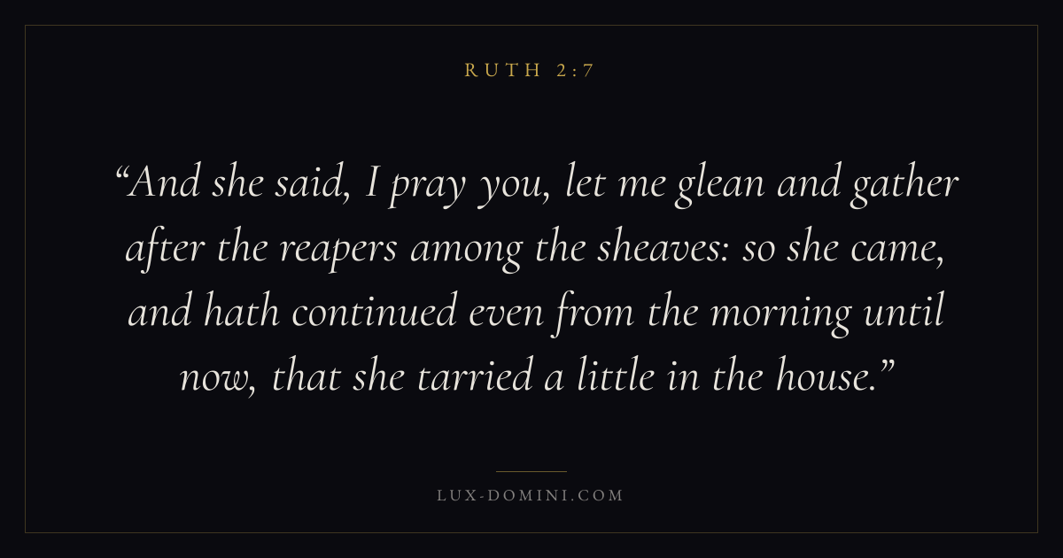 And she said, I pray you, let me glean and gather after the reapers among the sheaves: so she came, and hath continued even from the morning until now, that she tarried a little in the house.