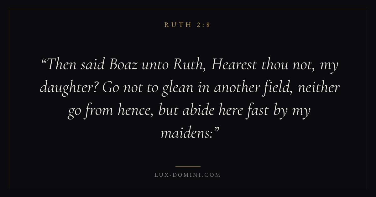 Then said Boaz unto Ruth, Hearest thou not, my daughter? Go not to glean in another field, neither go from hence, but abide here fast by my maidens: