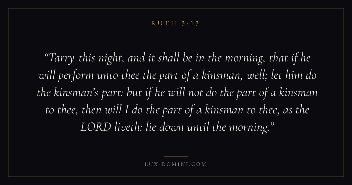 Tarry this night, and it shall be in the morning, that if he will perform unto thee the part of a kinsman, well; let him do the kinsman’s part: but if he will not do the part of a kinsman to thee, then will I do the part of a kinsman to thee, as the LORD liveth: lie down until the morning.