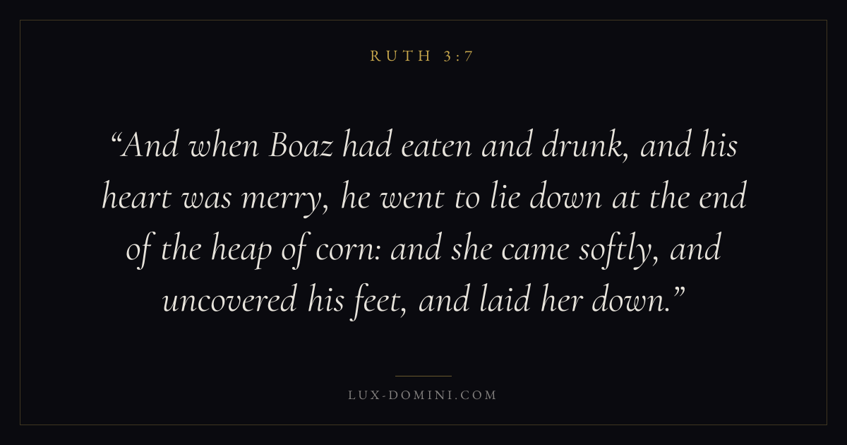 And when Boaz had eaten and drunk, and his heart was merry, he went to lie down at the end of the heap of corn: and she came softly, and uncovered his feet, and laid her down.