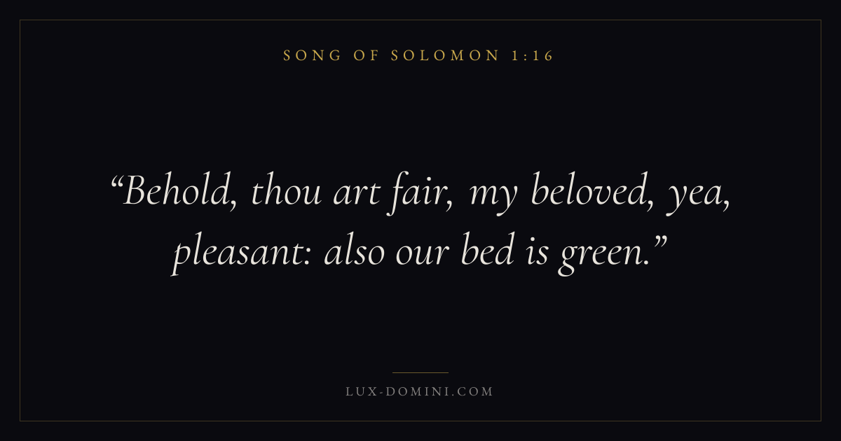 Books / Song of Solomon / Chapter 1 / Verse 16 ← Song of Solomon 1:15 Song of Solomon 1:16 Song of Solomon 1:17 → Behold, thou art fair, my beloved, yea, pleasant: also our bed is green. Download verse card Share on Twitter Share on Facebook Pin it ✦ Key themes LoveDesireBeautyUnion Read with Song of Solomon 1:17John 3:161 Corinthians 13:4 Related topics Bible verses about love ✦ Song of Solomon Chapter 1 verses V. 1 V. 2 V. 3 V. 4 V. 5 V. 6 V. 7 V. 8 V. 9 V. 10 V. 11 V. 12 V. 13 V. 14 V. 15 V. 16 V. 17