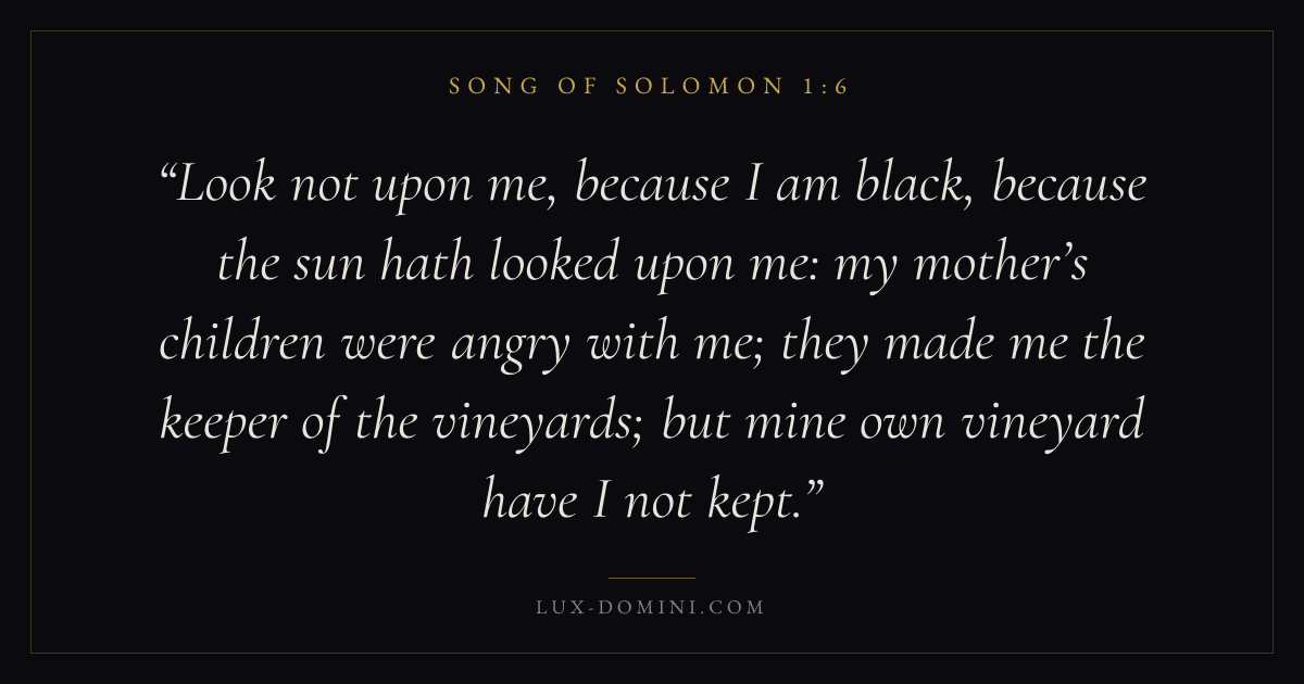 Look not upon me, because I am black, because the sun hath looked upon me: my mother’s children were angry with me; they made me the keeper of the vineyards; but mine own vineyard have I not kept.