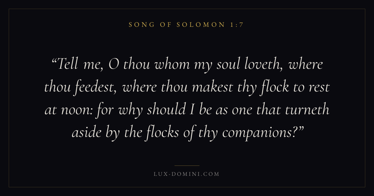 Tell me, O thou whom my soul loveth, where thou feedest, where thou makest thy flock to rest at noon: for why should I be as one that turneth aside by the flocks of thy companions?