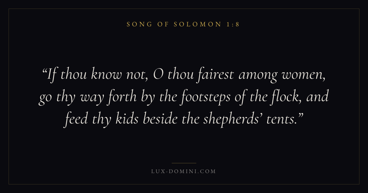 If thou know not, O thou fairest among women, go thy way forth by the footsteps of the flock, and feed thy kids beside the shepherds’ tents.