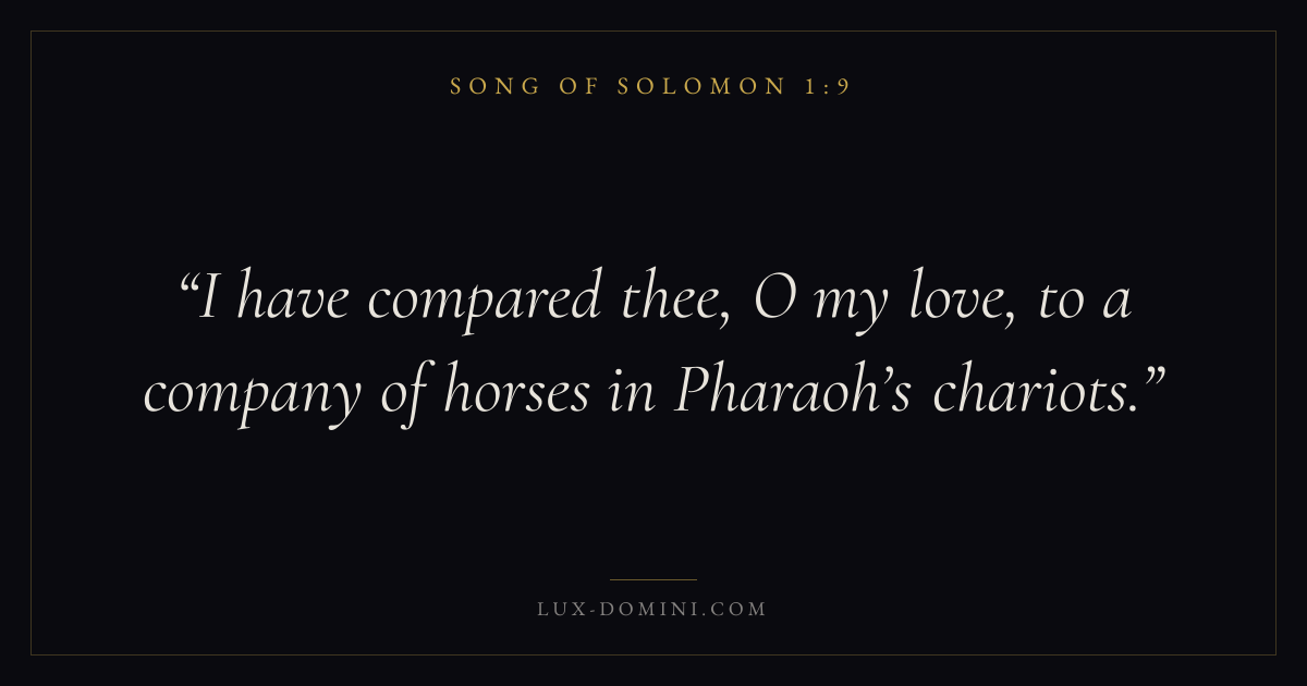 Books / Song of Solomon / Chapter 1 / Verse 9 ← Song of Solomon 1:8 Song of Solomon 1:9 Song of Solomon 1:10 → I have compared thee, O my love, to a company of horses in Pharaoh’s chariots. Download verse card Share on Twitter Share on Facebook Pin it ✦ Key themes LoveDesireBeautyUnion Read with Song of Solomon 1:8Song of Solomon 1:10John 3:161 Corinthians 13:4 Related topics Bible verses about love ✦ Song of Solomon Chapter 1 verses V. 1 V. 2 V. 3 V. 4 V. 5 V. 6 V. 7 V. 8 V. 9 V. 10 V. 11 V. 12 V. 13 V. 14 V. 15 V. 16 V. 17