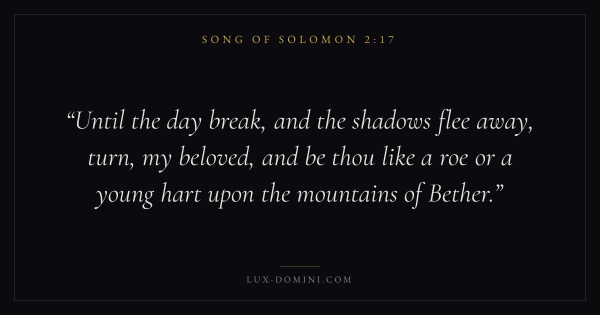 Until the day break, and the shadows flee away, turn, my beloved, and be thou like a roe or a young hart upon the mountains of Bether.
