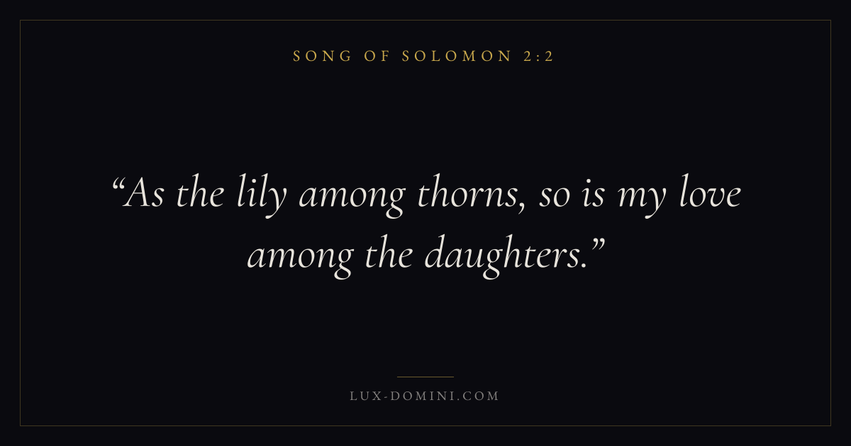 Books / Song of Solomon / Chapter 2 / Verse 2 ← Song of Solomon 2:1 Song of Solomon 2:2 Song of Solomon 2:3 → As the lily among thorns, so is my love among the daughters. Download verse card Share on Twitter Share on Facebook Pin it ✦ Key themes LoveDesireBeautyUnion Read with Song of Solomon 2:1John 3:161 Corinthians 13:4 Related topics Bible verses about love ✦ Song of Solomon Chapter 2 verses V. 1 V. 2 V. 3 V. 4 V. 5 V. 6 V. 7 V. 8 V. 9 V. 10 V. 11 V. 12 V. 13 V. 14 V. 15 V. 16 V. 17