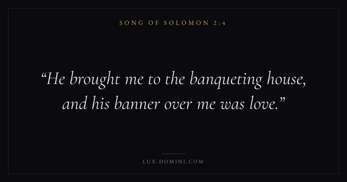 Books / Song of Solomon / Chapter 2 / Verse 4 ← Song of Solomon 2:3 Song of Solomon 2:4 Song of Solomon 2:5 → He brought me to the banqueting house, and his banner over me was love. Download verse card Share on Twitter Share on Facebook Pin it ✦ Key themes LoveDesireBeautyUnion Read with Song of Solomon 2:3Song of Solomon 2:5John 3:161 Corinthians 13:4 Related topics Bible verses about love ✦ Song of Solomon Chapter 2 verses V. 1 V. 2 V. 3 V. 4 V. 5 V. 6 V. 7 V. 8 V. 9 V. 10 V. 11 V. 12 V. 13 V. 14 V. 15 V. 16 V. 17