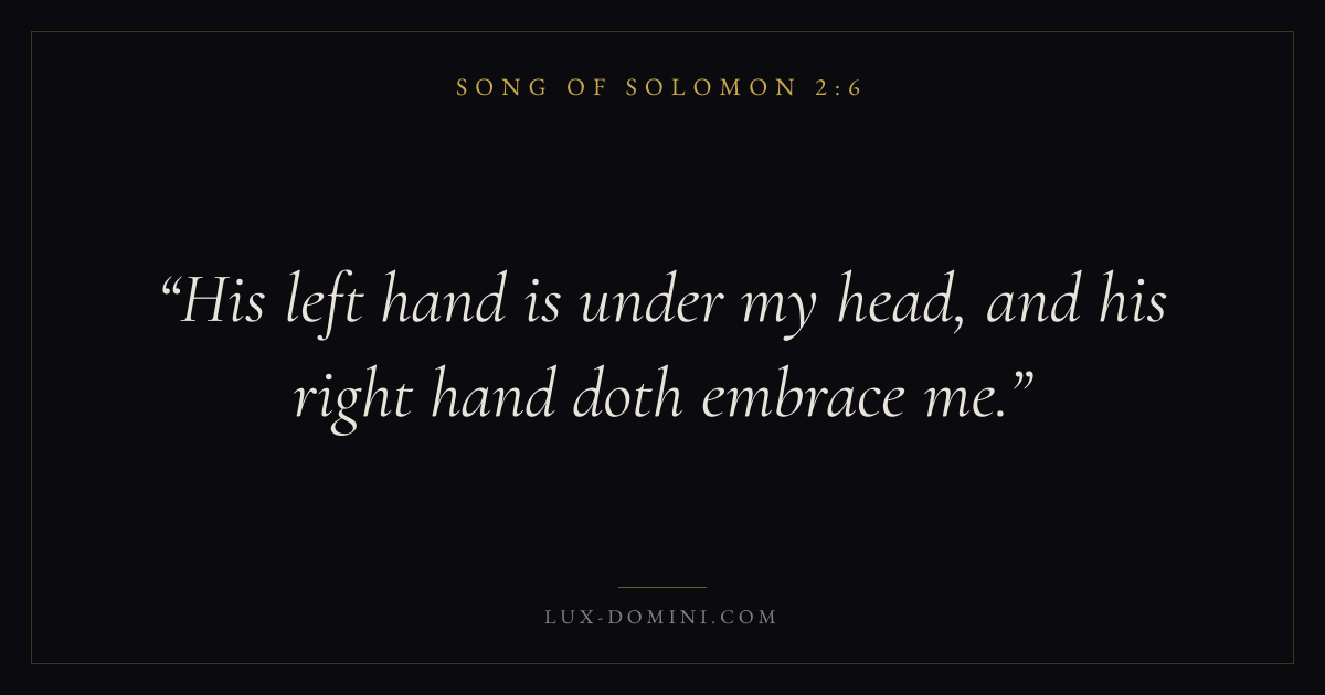 Books / Song of Solomon / Chapter 2 / Verse 6 ← Song of Solomon 2:5 Song of Solomon 2:6 Song of Solomon 2:7 → His left hand is under my head, and his right hand doth embrace me. Download verse card Share on Twitter Share on Facebook Pin it ✦ Key themes LoveDesireBeautyUnion Read with Song of Solomon 2:3Song of Solomon 2:4John 3:161 Corinthians 13:4 Related topics Bible verses about love ✦ Song of Solomon Chapter 2 verses V. 1 V. 2 V. 3 V. 4 V. 5 V. 6 V. 7 V. 8 V. 9 V. 10 V. 11 V. 12 V. 13 V. 14 V. 15 V. 16 V. 17