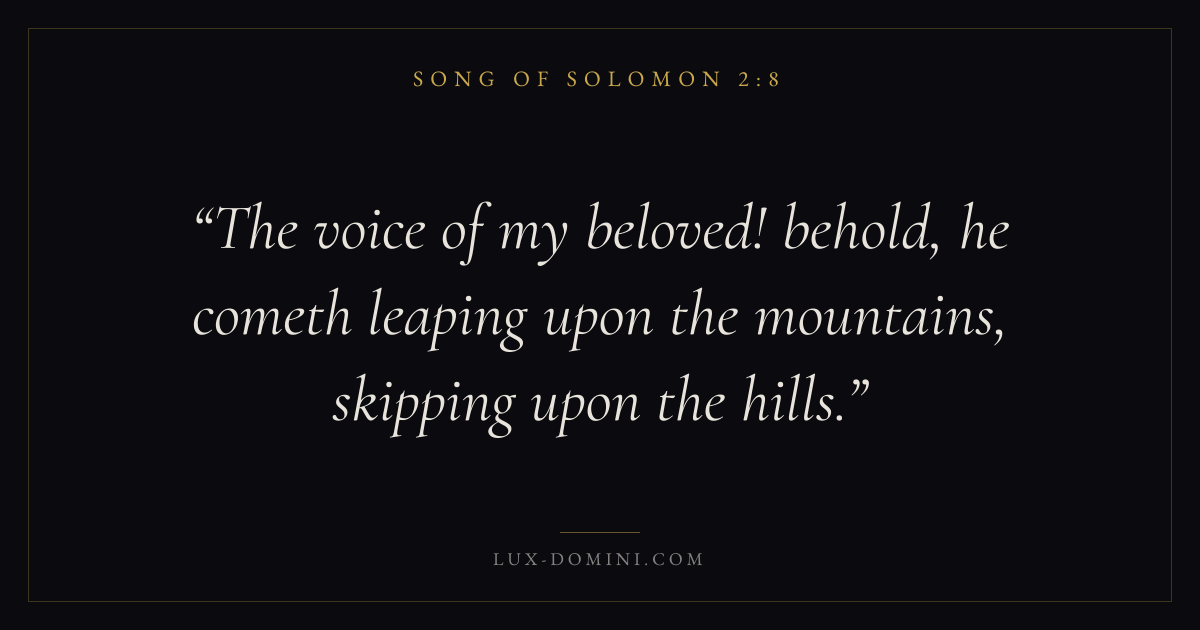 The voice of my beloved! behold, he cometh leaping upon the mountains, skipping upon the hills.