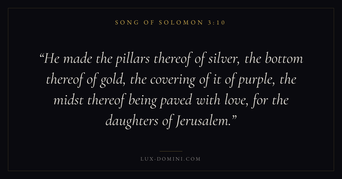 He made the pillars thereof of silver, the bottom thereof of gold, the covering of it of purple, the midst thereof being paved with love, for the daughters of Jerusalem.