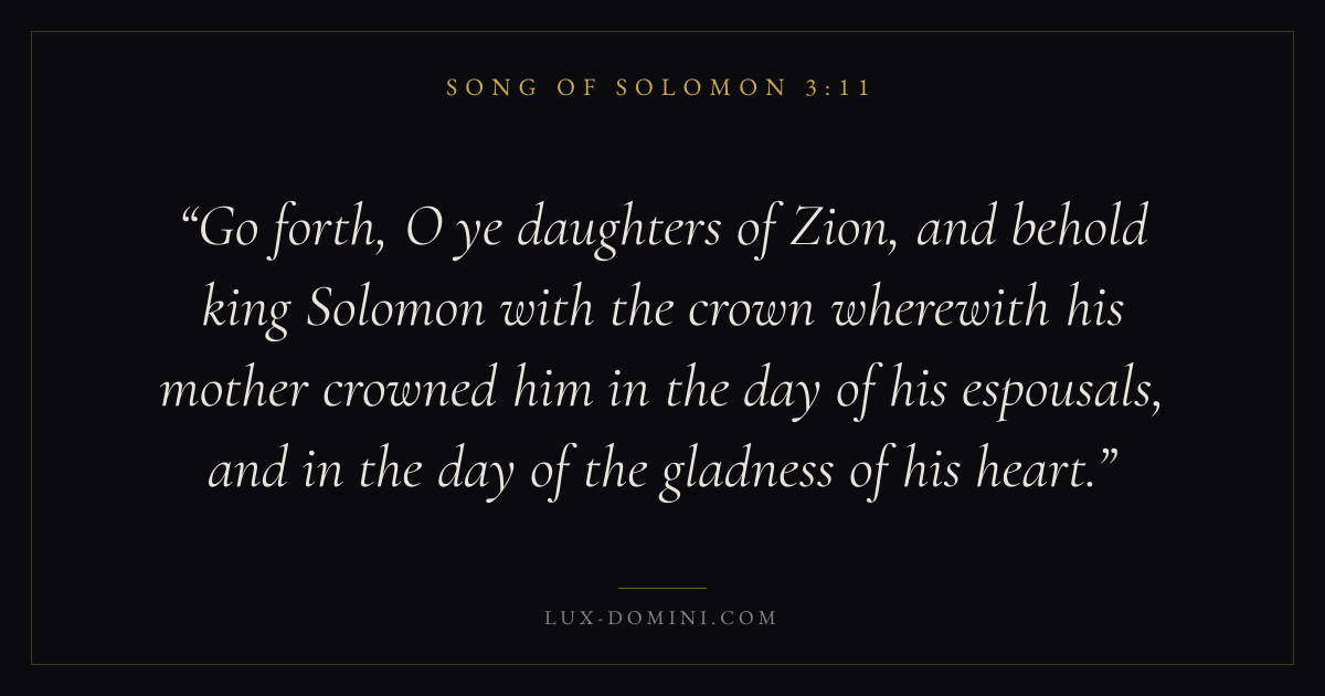 Go forth, O ye daughters of Zion, and behold king Solomon with the crown wherewith his mother crowned him in the day of his espousals, and in the day of the gladness of his heart.