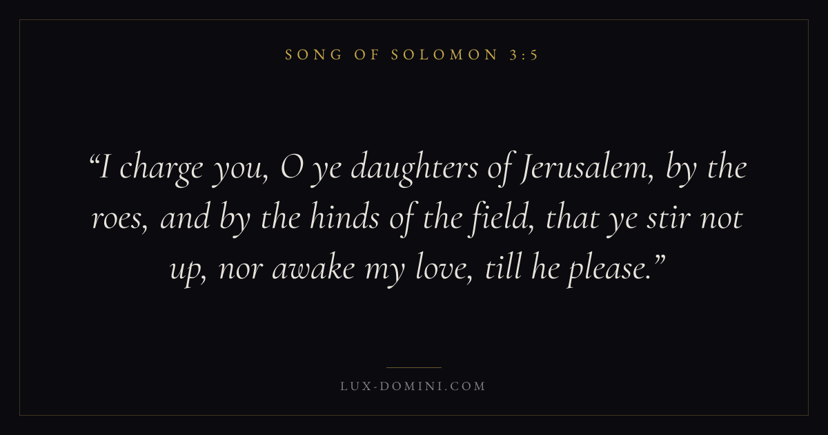 I charge you, O ye daughters of Jerusalem, by the roes, and by the hinds of the field, that ye stir not up, nor awake my love, till he please.