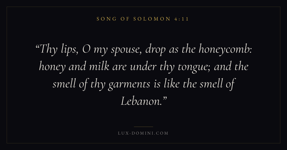 Thy lips, O my spouse, drop as the honeycomb: honey and milk are under thy tongue; and the smell of thy garments is like the smell of Lebanon.