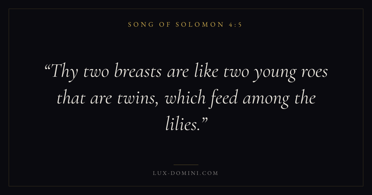 Books / Song of Solomon / Chapter 4 / Verse 5 ← Song of Solomon 4:4 Song of Solomon 4:5 Song of Solomon 4:6 → Thy two breasts are like two young roes that are twins, which feed among the lilies. Download verse card Share on Twitter Share on Facebook Pin it ✦ Key themes LoveDesireBeautyUnion Read with Song of Solomon 4:6Song of Solomon 4:7John 3:161 Corinthians 13:4 Related topics Bible verses about love ✦ Song of Solomon Chapter 4 verses V. 1 V. 2 V. 3 V. 4 V. 5 V. 6 V. 7 V. 8 V. 9 V. 10 V. 11 V. 12 V. 13 V. 14 V. 15 V. 16