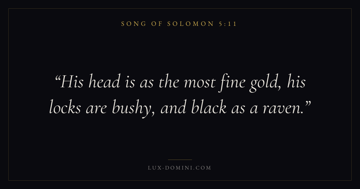 Books / Song of Solomon / Chapter 5 / Verse 11 ← Song of Solomon 5:10 Song of Solomon 5:11 Song of Solomon 5:12 → His head is as the most fine gold, his locks are bushy, and black as a raven. Download verse card Share on Twitter Share on Facebook Pin it ✦ Key themes LoveDesireBeautyUnion Read with Song of Solomon 5:12John 3:161 Corinthians 13:4 Related topics Bible verses about love ✦ Song of Solomon Chapter 5 verses V. 1 V. 2 V. 3 V. 4 V. 5 V. 6 V. 7 V. 8 V. 9 V. 10 V. 11 V. 12 V. 13 V. 14 V. 15 V. 16