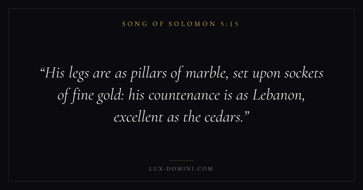 His legs are as pillars of marble, set upon sockets of fine gold: his countenance is as Lebanon, excellent as the cedars.