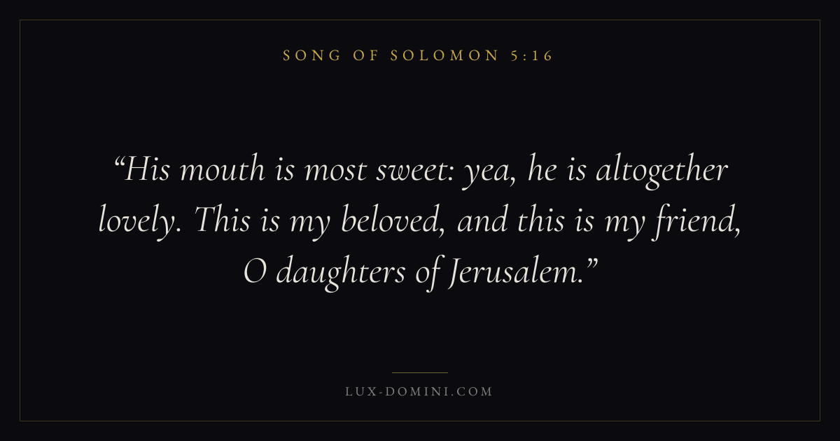 His mouth is most sweet: yea, he is altogether lovely. This is my beloved, and this is my friend, O daughters of Jerusalem.