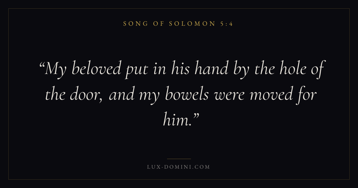 Books / Song of Solomon / Chapter 5 / Verse 4 ← Song of Solomon 5:3 Song of Solomon 5:4 Song of Solomon 5:5 → My beloved put in his hand by the hole of the door, and my bowels were moved for him. Download verse card Share on Twitter Share on Facebook Pin it ✦ Key themes LoveDesireBeautyUnion Read with Song of Solomon 5:5John 3:161 Corinthians 13:4 Related topics Bible verses about love ✦ Song of Solomon Chapter 5 verses V. 1 V. 2 V. 3 V. 4 V. 5 V. 6 V. 7 V. 8 V. 9 V. 10 V. 11 V. 12 V. 13 V. 14 V. 15 V. 16