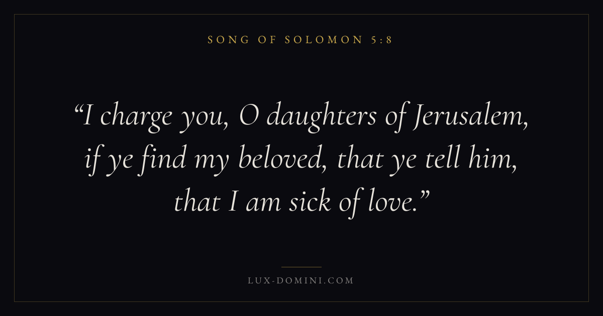 I charge you, O daughters of Jerusalem, if ye find my beloved, that ye tell him, that I am sick of love.