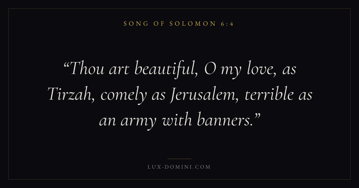Thou art beautiful, O my love, as Tirzah, comely as Jerusalem, terrible as an army with banners.
