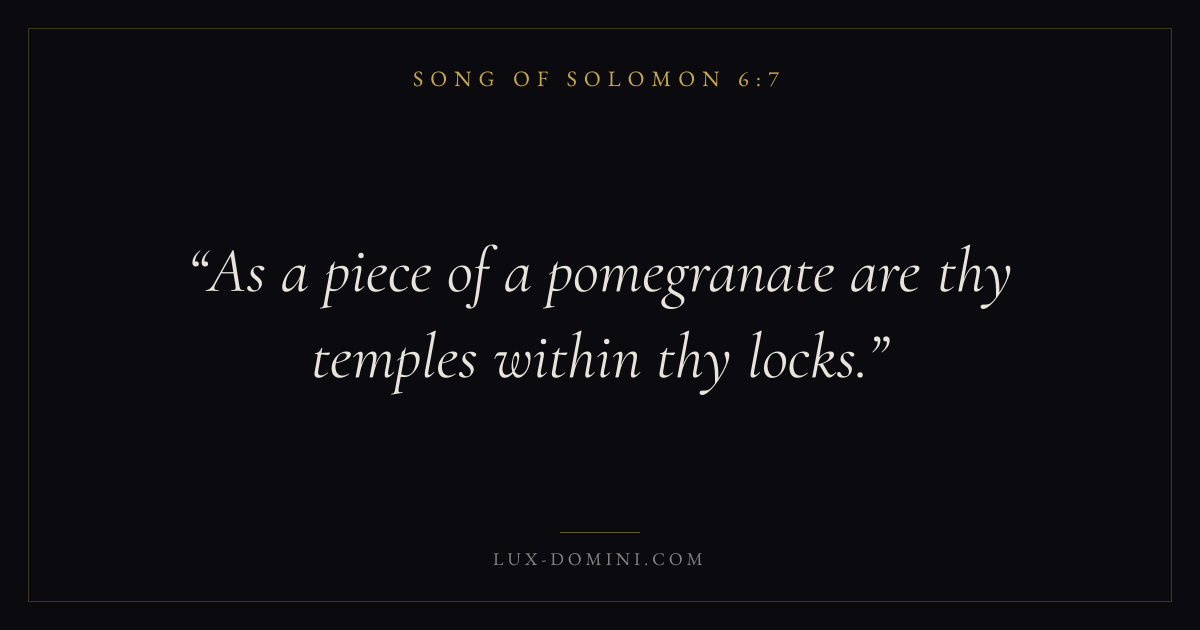 Books / Song of Solomon / Chapter 6 / Verse 7 ← Song of Solomon 6:6 Song of Solomon 6:7 Song of Solomon 6:8 → As a piece of a pomegranate are thy temples within thy locks. Download verse card Share on Twitter Share on Facebook Pin it ✦ Key themes LoveDesireBeautyUnion Read with Song of Solomon 6:6John 3:161 Corinthians 13:4 Related topics Bible verses about love ✦ Song of Solomon Chapter 6 verses V. 1 V. 2 V. 3 V. 4 V. 5 V. 6 V. 7 V. 8 V. 9 V. 10 V. 11 V. 12 V. 13