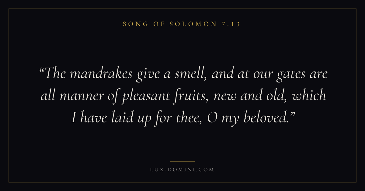 The mandrakes give a smell, and at our gates are all manner of pleasant fruits, new and old, which I have laid up for thee, O my beloved.