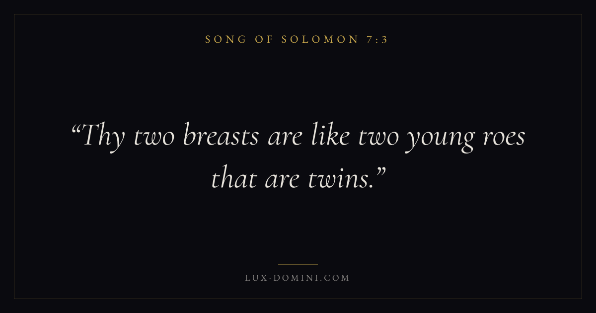 Books / Song of Solomon / Chapter 7 / Verse 3 ← Song of Solomon 7:2 Song of Solomon 7:3 Song of Solomon 7:4 → Thy two breasts are like two young roes that are twins. Download verse card Share on Twitter Share on Facebook Pin it ✦ Key themes LoveDesireBeautyUnion Read with Song of Solomon 7:4John 3:161 Corinthians 13:4 Related topics Bible verses about love ✦ Song of Solomon Chapter 7 verses V. 1 V. 2 V. 3 V. 4 V. 5 V. 6 V. 7 V. 8 V. 9 V. 10 V. 11 V. 12 V. 13