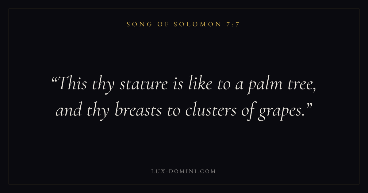 Books / Song of Solomon / Chapter 7 / Verse 7 ← Song of Solomon 7:6 Song of Solomon 7:7 Song of Solomon 7:8 → This thy stature is like to a palm tree, and thy breasts to clusters of grapes. Download verse card Share on Twitter Share on Facebook Pin it ✦ Key themes LoveDesireBeautyUnion Read with Song of Solomon 7:5Song of Solomon 7:6John 3:161 Corinthians 13:4 Related topics Bible verses about love ✦ Song of Solomon Chapter 7 verses V. 1 V. 2 V. 3 V. 4 V. 5 V. 6 V. 7 V. 8 V. 9 V. 10 V. 11 V. 12 V. 13