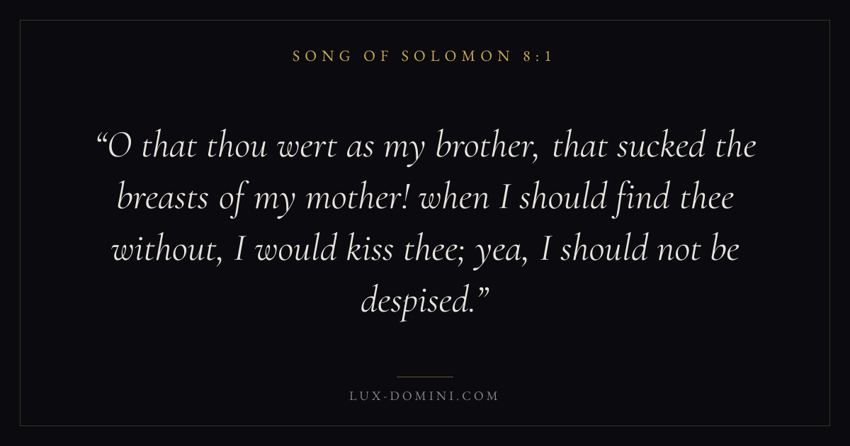 O that thou wert as my brother, that sucked the breasts of my mother! when I should find thee without, I would kiss thee; yea, I should not be despised.