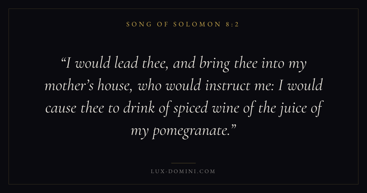 I would lead thee, and bring thee into my mother’s house, who would instruct me: I would cause thee to drink of spiced wine of the juice of my pomegranate.