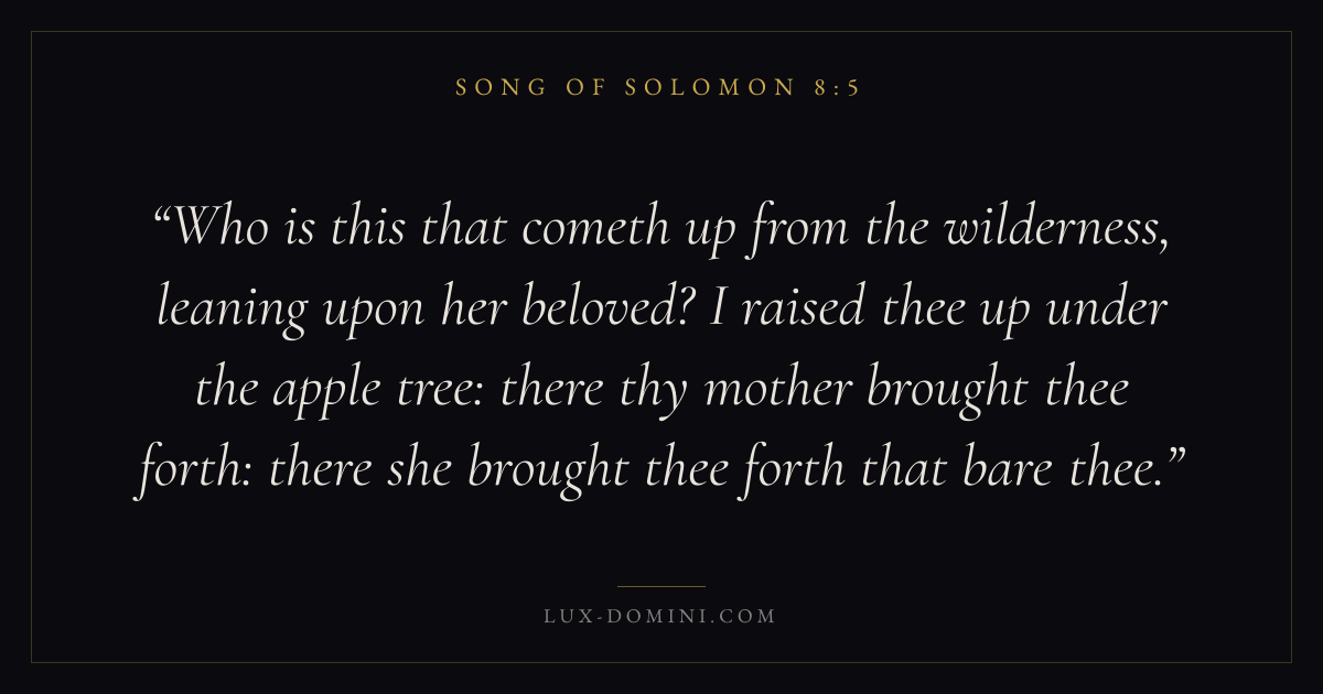 Who is this that cometh up from the wilderness, leaning upon her beloved? I raised thee up under the apple tree: there thy mother brought thee forth: there she brought thee forth that bare thee.