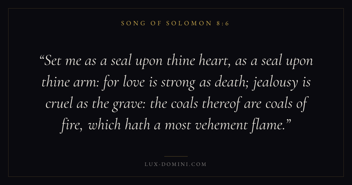 Set me as a seal upon thine heart, as a seal upon thine arm: for love is strong as death; jealousy is cruel as the grave: the coals thereof are coals of fire, which hath a most vehement flame.