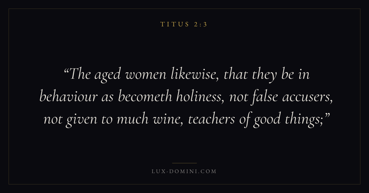 The aged women likewise, that they be in behaviour as becometh holiness, not false accusers, not given to much wine, teachers of good things;