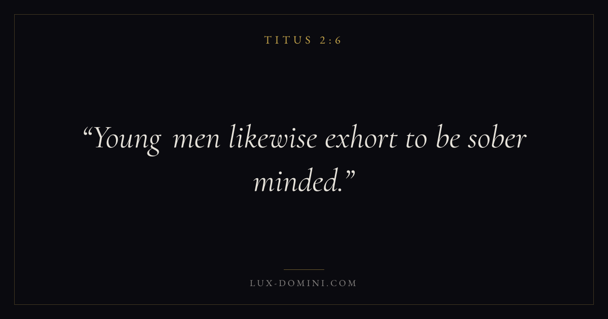 Books / Titus / Chapter 2 / Verse 6 ← Titus 2:5 Titus 2:6 Titus 2:7 → Young men likewise exhort to be sober minded. Download verse card Share on Twitter Share on Facebook Pin it ✦ Key themes GraceGood worksOrderLeadership Read with Titus 2:7Titus 2:8Ephesians 2:82 Corinthians 12:9 Related topics Bible verses about graceBible verses about leadership ✦ Titus Chapter 2 verses V. 1 V. 2 V. 3 V. 4 V. 5 V. 6 V. 7 V. 8 V. 9 V. 10 V. 11 V. 12 V. 13 V. 14 V. 15