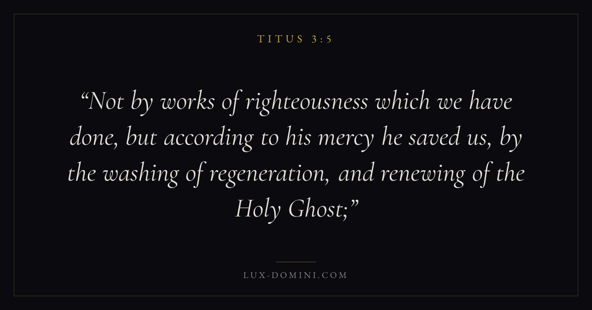 Not by works of righteousness which we have done, but according to his mercy he saved us, by the washing of regeneration, and renewing of the Holy Ghost;