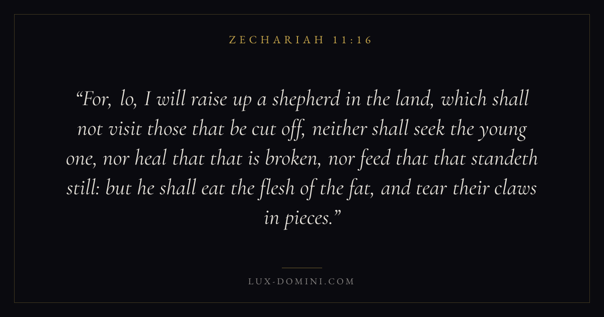 For, lo, I will raise up a shepherd in the land, which shall not visit those that be cut off, neither shall seek the young one, nor heal that that is broken, nor feed that that standeth still: but he shall eat the flesh of the fat, and tear their claws in pieces.