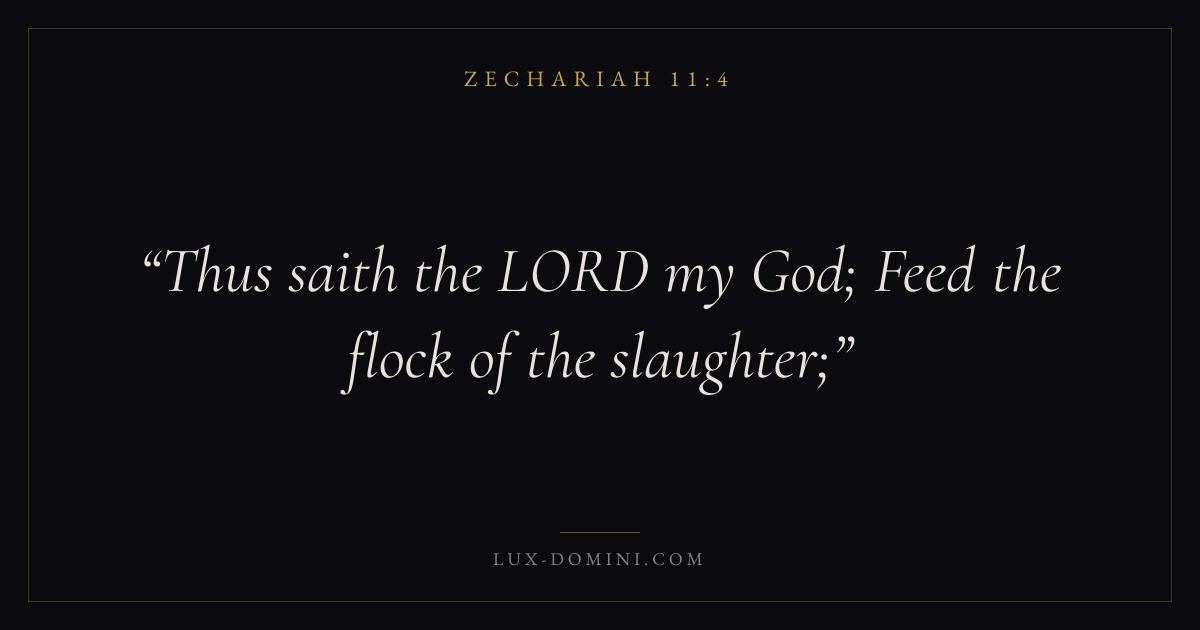 Books / Zechariah / Chapter 11 / Verse 4 ← Zechariah 11:3 Zechariah 11:4 Zechariah 11:5 → Thus saith the LORD my God; Feed the flock of the slaughter; Download verse card Share on Twitter Share on Facebook Pin it ✦ Key themes Justice and mercyReturnTempleMessiah Read with Zechariah 11:5Zechariah 11:6Micah 6:8Amos 5:24 Related topics Bible verses about justice and mercy ✦ Zechariah Chapter 11 verses V. 1 V. 2 V. 3 V. 4 V. 5 V. 6 V. 7 V. 8 V. 9 V. 10 V. 11 V. 12 V. 13 V. 14 V. 15 V. 16 V. 17