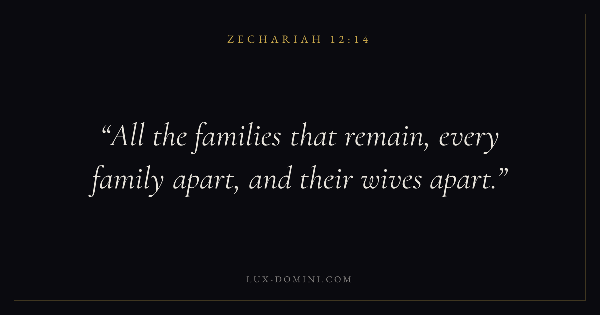 Books / Zechariah / Chapter 12 / Verse 14 ← Zechariah 12:13 Zechariah 12:14 Zechariah 13:1 → All the families that remain, every family apart, and their wives apart. Download verse card Share on Twitter Share on Facebook Pin it ✦ Key themes SalvationReturnTempleMessiah Read with Zechariah 12:11Zechariah 12:12John 3:16Ephesians 2:8 Related topics Bible verses about salvation ✦ Zechariah Chapter 12 verses V. 1 V. 2 V. 3 V. 4 V. 5 V. 6 V. 7 V. 8 V. 9 V. 10 V. 11 V. 12 V. 13 V. 14