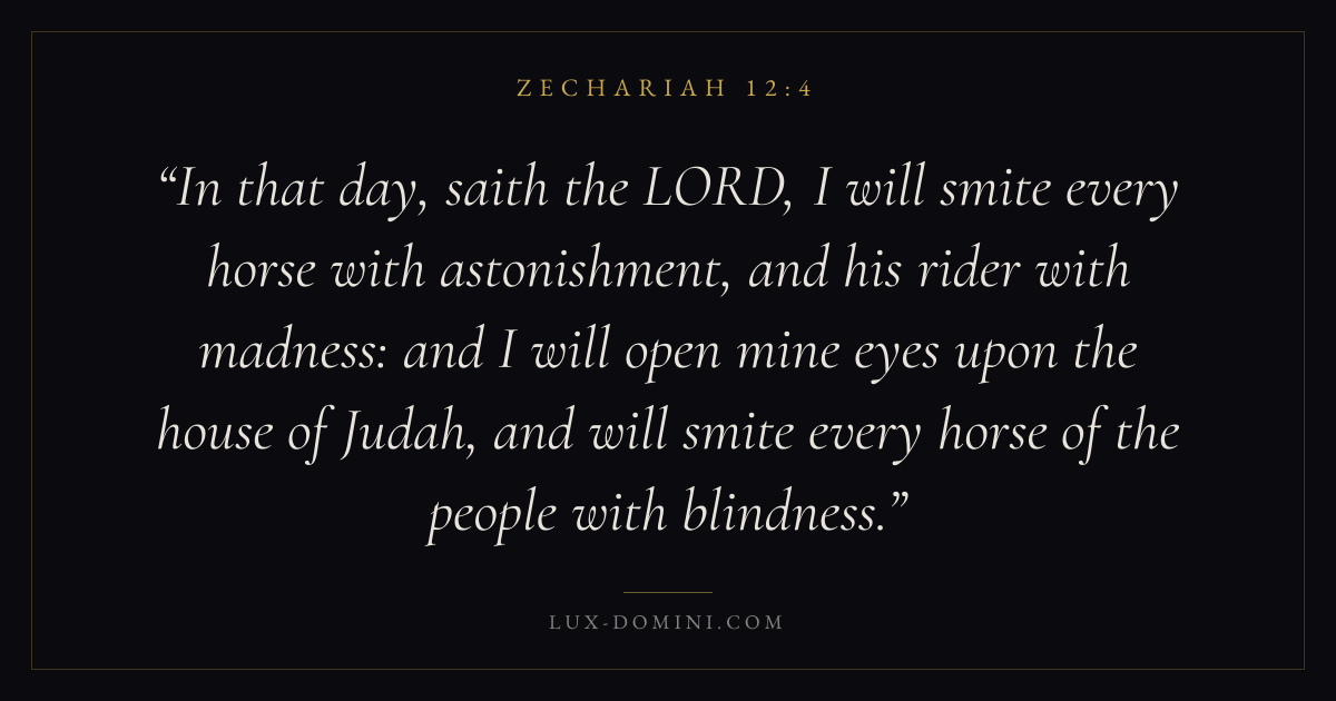 In that day, saith the LORD, I will smite every horse with astonishment, and his rider with madness: and I will open mine eyes upon the house of Judah, and will smite every horse of the people with blindness.