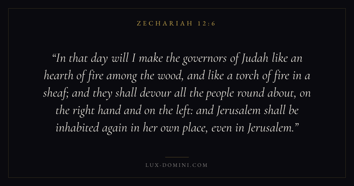 In that day will I make the governors of Judah like an hearth of fire among the wood, and like a torch of fire in a sheaf; and they shall devour all the people round about, on the right hand and on the left: and Jerusalem shall be inhabited again in her own place, even in Jerusalem.