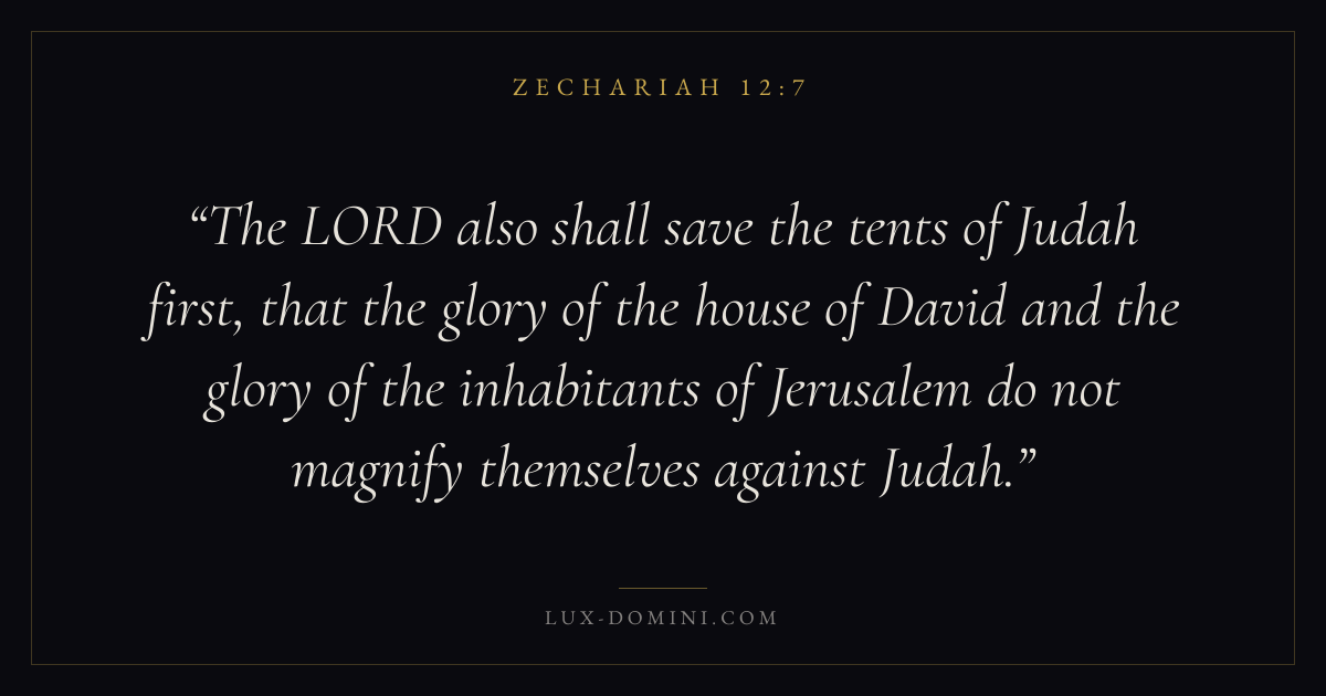 The LORD also shall save the tents of Judah first, that the glory of the house of David and the glory of the inhabitants of Jerusalem do not magnify themselves against Judah.