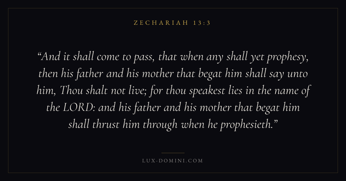 And it shall come to pass, that when any shall yet prophesy, then his father and his mother that begat him shall say unto him, Thou shalt not live; for thou speakest lies in the name of the LORD: and his father and his mother that begat him shall thrust him through when he prophesieth.