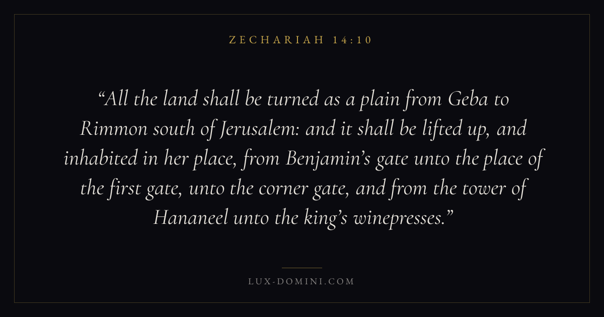 All the land shall be turned as a plain from Geba to Rimmon south of Jerusalem: and it shall be lifted up, and inhabited in her place, from Benjamin’s gate unto the place of the first gate, unto the corner gate, and from the tower of Hananeel unto the king’s winepresses.