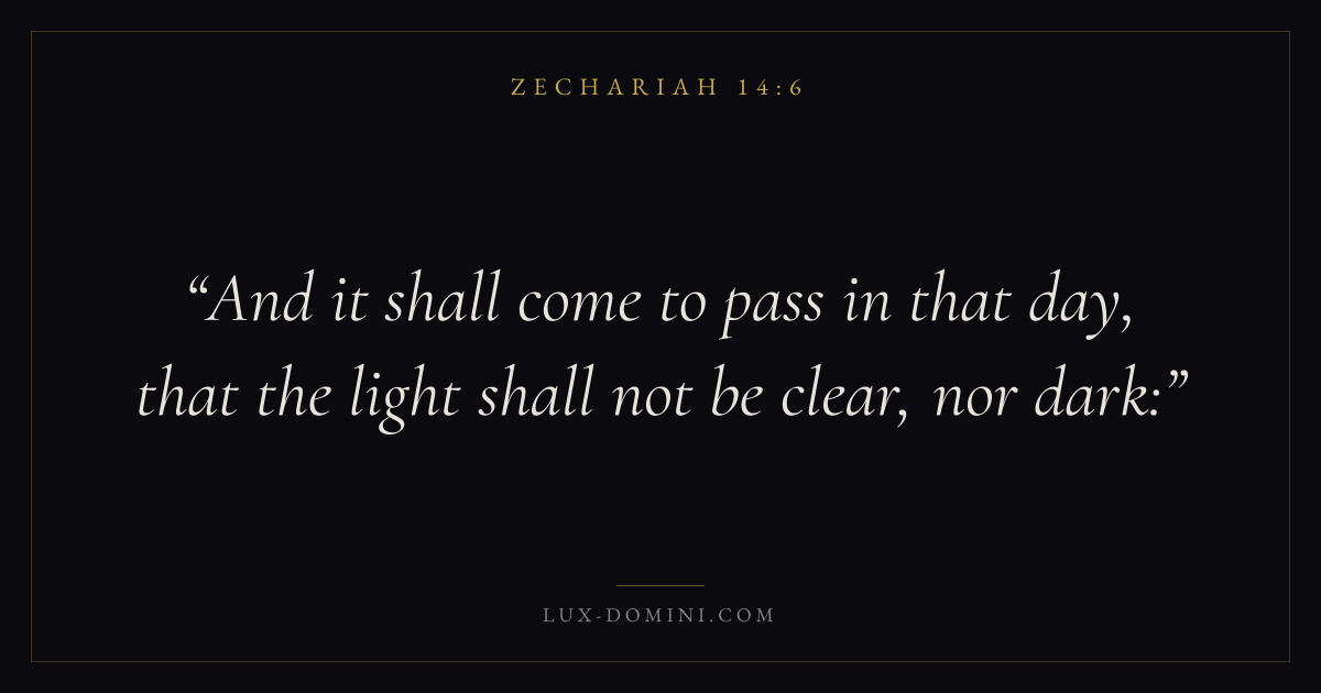 Books / Zechariah / Chapter 14 / Verse 6 ← Zechariah 14:5 Zechariah 14:6 Zechariah 14:7 → And it shall come to pass in that day, that the light shall not be clear, nor dark: Download verse card Share on Twitter Share on Facebook Pin it ✦ Key themes ReturnTempleMessiahJerusalem Read with Zechariah 14:4Zechariah 14:5 ✦ Zechariah Chapter 14 verses V. 1 V. 2 V. 3 V. 4 V. 5 V. 6 V. 7 V. 8 V. 9 V. 10 V. 11 V. 12 V. 13 V. 14 V. 15 V. 16 V. 17 V. 18 V. 19 V. 20 V. 21