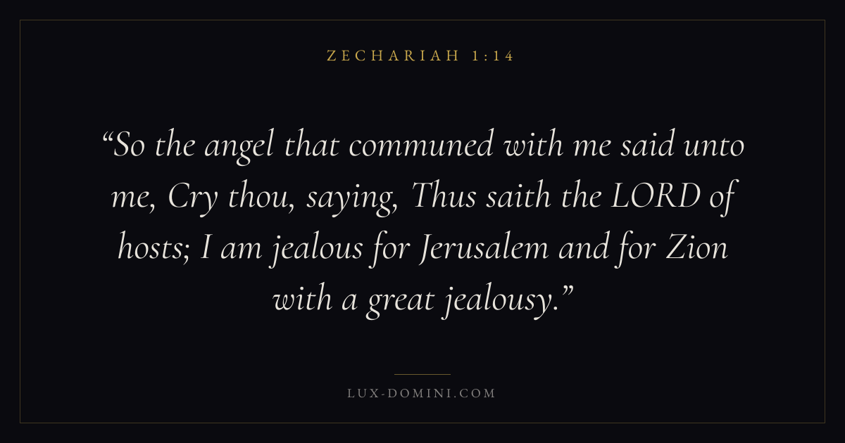 So the angel that communed with me said unto me, Cry thou, saying, Thus saith the LORD of hosts; I am jealous for Jerusalem and for Zion with a great jealousy.