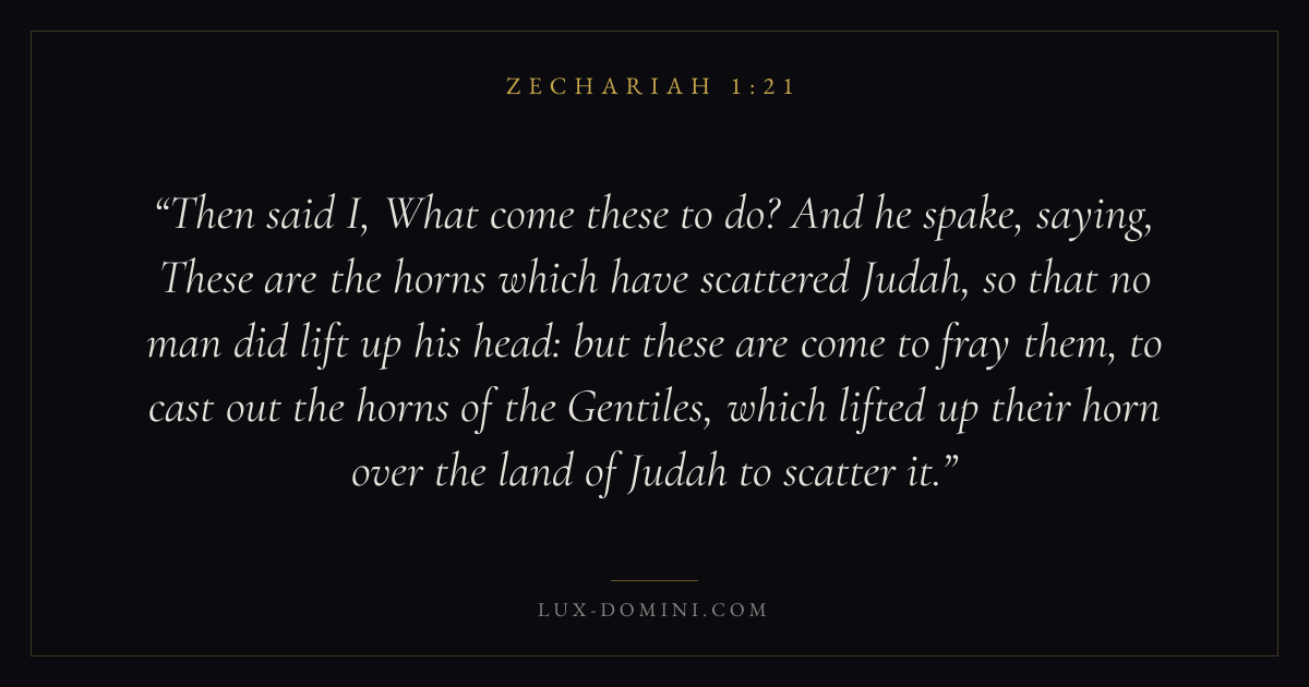 Then said I, What come these to do? And he spake, saying, These are the horns which have scattered Judah, so that no man did lift up his head: but these are come to fray them, to cast out the horns of the Gentiles, which lifted up their horn over the land of Judah to scatter it.