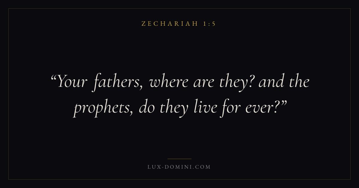 Books / Zechariah / Chapter 1 / Verse 5 ← Zechariah 1:4 Zechariah 1:5 Zechariah 1:6 → Your fathers, where are they? and the prophets, do they live for ever? Download verse card Share on Twitter Share on Facebook Pin it ✦ Key themes ReturnTempleMessiahJerusalem Read with Zechariah 1:4Zechariah 1:6 ✦ Zechariah Chapter 1 verses V. 1 V. 2 V. 3 V. 4 V. 5 V. 6 V. 7 V. 8 V. 9 V. 10 V. 11 V. 12 V. 13 V. 14 V. 15 V. 16 V. 17 V. 18 V. 19 V. 20 V. 21